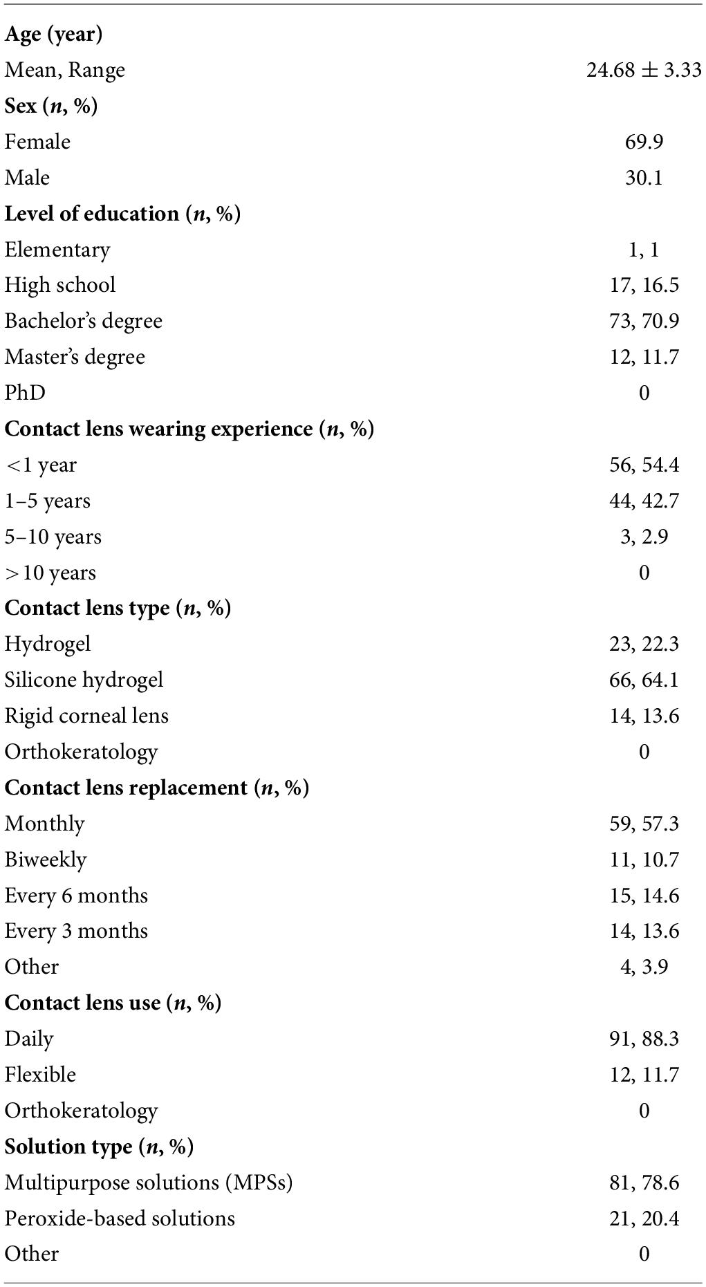 Participants ranged in age from 16 to 32 years, with a mean age of 24.68 ± 3.33 years. The majority was female (72 participants; 69.9%). Most respondents held an undergraduate degree (73; 70.9%). Regarding contact lens experience, 56 participants (54.4%) had been wearing lenses for less than 1 year, while 44 (42.7%) had between 1 and 5 years of wearing experience.