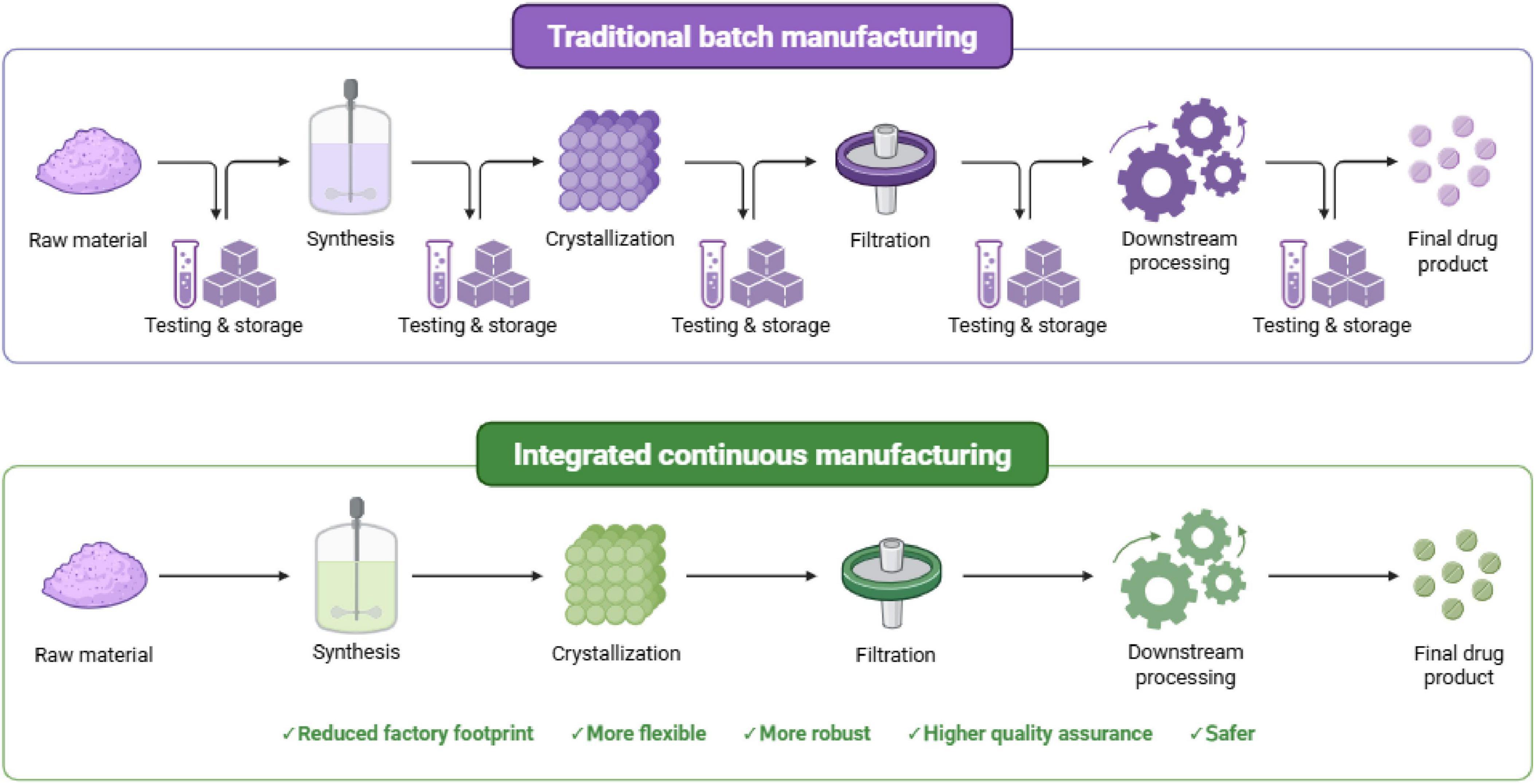 Figure 2. Comparison of traditional batch manufacturing and integrated continuous manufacturing (CM) in pharmaceutical production.