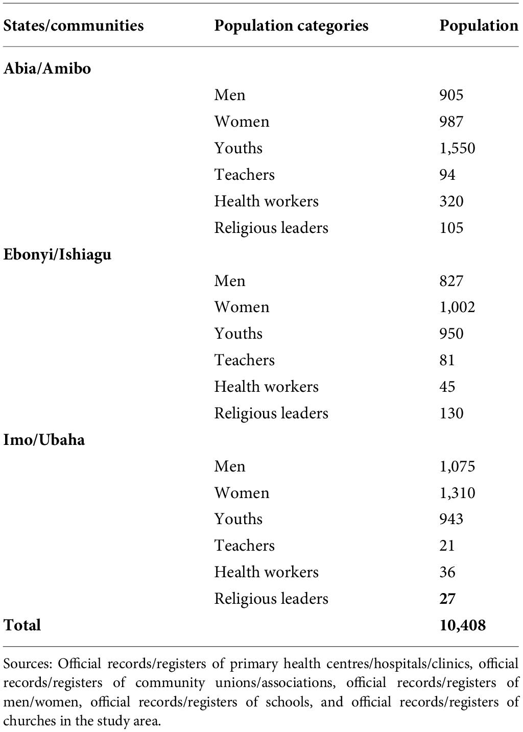 Multi-stage stratified cluster sampling is adopted. First, three out of the five states were selected. The five states were numbered, and three out of the five were selected. The selected states are Abia, Ebonyi, and Imo states. Next, three LGA, one from each of the selected states, were selected. All the LGA in each of the selected states were numbered, and one was selected from each state, making it a total of three LGA. The selected LGA are Umuahia-South (Abia State), Ivo (Ebonyi State), and Okigwe (Imo State). Furthermore, all the communities in each of the selected local governments were numbered, and one was selected from each of the LGAs, making it a total of three communities. The selected communities are Amibo (Umuahia-South, Abia State), Ishiagu (Ivo, Ebonyi State), and Ubaha (Okigwe, Imo State). In order to collect appropriate data for the study, six relevant population categories were created in each community. The members of each population category formed the respondents for the study. The stratified proportionate sampling technique was used in selecting the respondents from each population category in view of the fact that the population categories did not have equal size. The availability sampling technique was used to select the actual respondents from each population category, as shown in Table 3.